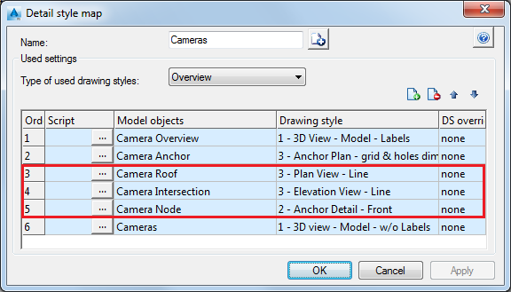 Your camera details are created using the drawing style set in the process detail map, for each type of camera: