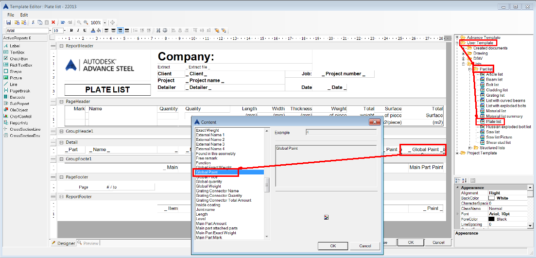 The total surface or paint area of plates can be displayed in BOM lists. The surface value takes into account any contour feature, chamfer or fillet which is present on the plate.