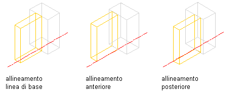 Per allineare un riempimento in modo che risulti centrato, davanti o dietro rispetto alla linea di base dell'assieme porta/finestra, attenersi alla procedura descritta nella presente sezione. In vista piana, la parte anteriore di un assieme porta/finestra (disegnato da sinistra a destra) si trova al di sotto della linea di base, mentre la parte posteriore si trova al di sopra della linea di base.