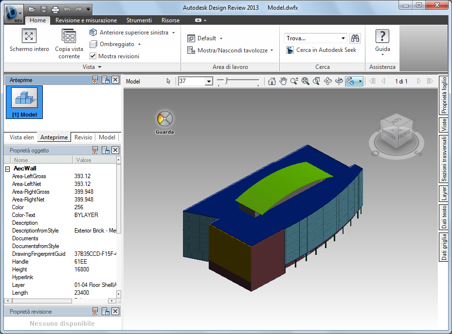 È possibile pubblicare i file DWG in formato DWF o DWFx come modelli 2D o 3D con i dati del gruppo voci di computo associati. Quando tali file vengono visualizzati mediante Autodesk Design Review, è possibile selezionare i componenti che rappresentano oggetti e visualizzarne le informazioni nella tavolozza Proprietà oggetto.