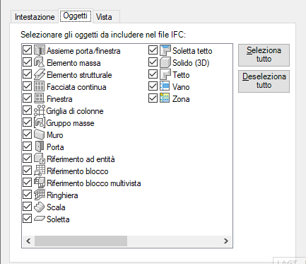 - Fare clic sulla scheda Oggetti e selezionare gli oggetti da includere nel file IFC.