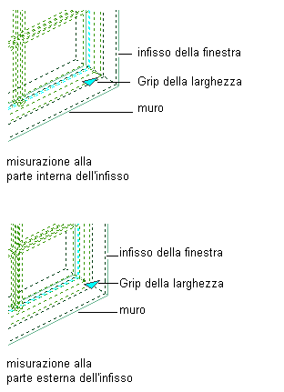 | La larghezza di un riquadro di finestra ad angolo non ancorato a un muro | Digitare un valore per Larghezza 2 o utilizzare lo strumento Seleziona per selezionare due punti per specificare una distanza. |