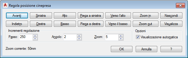 Alla selezione di ciascun pulsante, la vista cambia secondo incrementi determinati in base ai valori della sezione Incrementi regolazione. Se è selezionata l'opzione Visualizzazione automatica, sarà possibile vedere le modifiche dopo la selezione di ciascun pulsante. Se l'opzione Visualizzazione automatica è disattivata, fare clic su Visualizza per vedere le modifiche.