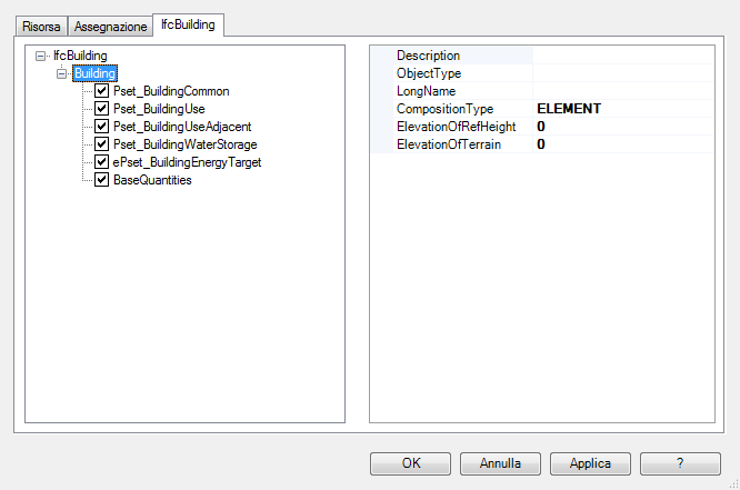 Nella finestra di dialogo Risorsa e assegnazione IFC, fare clic sulla scheda IfcBuilding.