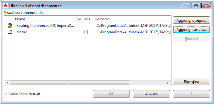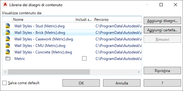 Quando si aggiunge un file di disegno o una cartella di file di disegno alla Libreria dei disegni di contenuto, gli stili o le definizioni di sistema diventano disponibili per l'utilizzo nel disegno corrente.