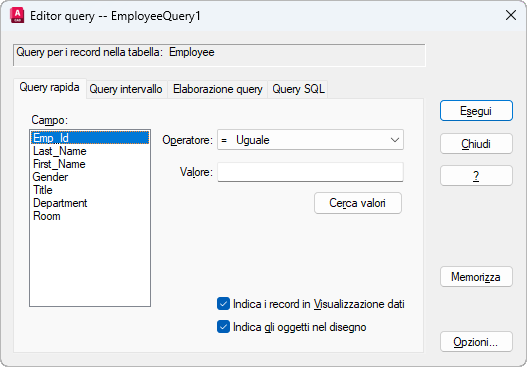 Apre la finestra di dialogo Opzioni di visualizzazione dati e di query.