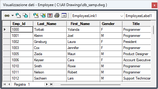 Fare doppio clic su una tabella di database o su un modello di collegamento in Gestione collegamento database. Se si fa doppio clic su un modello di collegamento che non dispone di alcun collegamento creato nel disegno al quale è associato, viene visualizzata la finestra di dialogo Modello di collegamento. La tabella di database viene aperta in modalità di modifica o di sola lettura, a seconda delle impostazioni specificate nell'area Opzioni Collega database della scheda Sistema nella finestra di dialogo Opzioni.