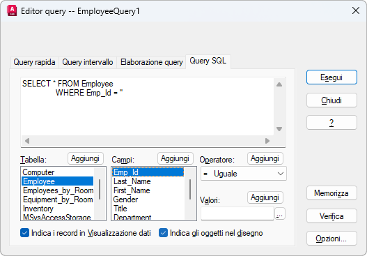 La scheda Query SQL contiene sia una casella di testo in cui è possibile digitare un'istruzione SQL in formato libero che un insieme di strumenti che semplificano la creazione della query. Poiché non tutti i sistemi di gestione database sono completamente compatibili con lo standard SQL 92, si consiglia di consultare la documentazione relativa al proprio sistema per conoscere quali comandi SQL possono essere utilizzati con il database.