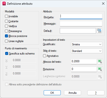 Assegna agli attributi un valore fisso quando si inserisce il blocco. Questa impostazione viene utilizzata per informazioni permanenti.