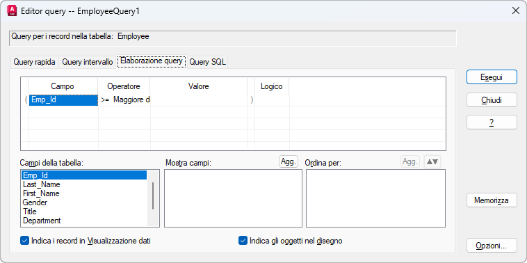 È anche possibile raggruppare i criteri utilizzando le parentesi, selezionare i campi da visualizzare nella query restituita e specificare una sequenza di ordinamento per i campi.