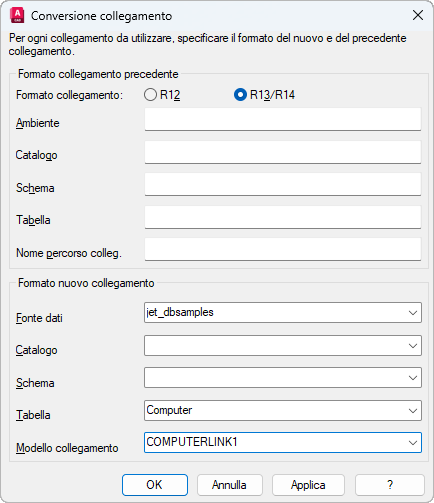 Poiché i collegamenti esistenti sono memorizzati in formati notevolmente diversi da quello di AutoCAD 2000 e versioni successive, il processo di conversione del collegamento richiede il mappaggio dei precedenti valori di collegamento ASE (AutoCAD SQL Extension ) nei nuovi valori utilizzati da AutoCAD 2000 e versioni successive. Ad esempio, è necessario identificare l'ambiente utilizzato da un particolare collegamento nella release 14 e specificare la fonte dati corrispondente che si desidera sostituire a questo ambiente in AutoCAD 2000 e versioni successive. Mappaggi simili devono essere stabiliti tra tutti i precedenti valori di collegamento ASE e i nuovi valori da utilizzare.