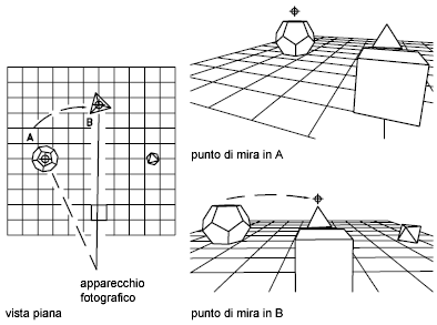 Definisce la proiezione parallela o le viste prospettiche utilizzando un apparecchio fotografico e un punto di mira.