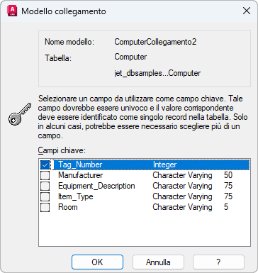 Visualizza tutti i campi disponibili per la tabella di database corrente, specificando anche il tipo e, nel caso dei campi per l'immissione di caratteri, la lunghezza del campo. Per specificare i campi chiave del modello di collegamento, selezionare la casella di controllo a sinistra del nome del campo dati.