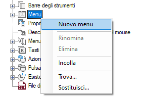 Nella scheda Personalizza, nel riquadro Personalizzazioni in <nome file>, fare clic sul segno più (+) accanto al nodo Menu per espanderlo.