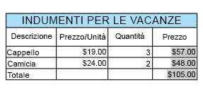 - Eseguire la stessa operazione per le celle di dati sotto le intestazioni Quantità e Prezzo. Per le celle in Quantità, scegliere Numero intero e per le celle in Prezzo, scegliere di nuovo Valuta.
