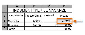 - Analogamente, nella cella D4, immettere =B4*C4.