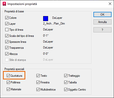 4. Assicurarsi che sia selezionata l'opzione Quotatura in Proprietà speciali e fare clic su OK.