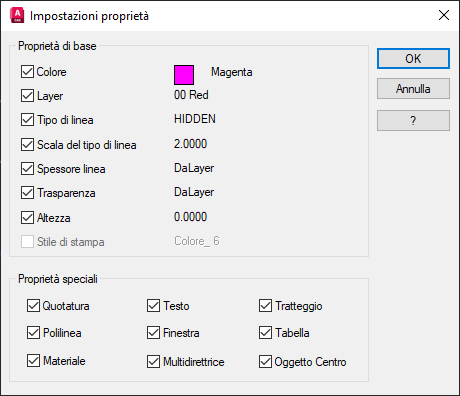 Le proprietà speciali applicano proprietà specifiche del tipo di oggetto di origine. Per gli oggetti quota includono lo stile di quota e altro ancora.
