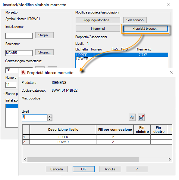 Il simbolo di un morsetto dello schema può rappresentare un morsetto a livello singolo o un livello di un morsetto multilivello. Il numero di livelli del morsetto viene definito come proprietà di blocco. Ogni livello presenta determinate caratteristiche, quali un'etichetta, dei fili per connessione, il pin sinistro e il pin destro. Ogni simbolo di morsetto dello schema presenta tutte le proprietà di blocco dei singoli livelli. Pertanto, la rimozione di un simbolo di morsetto non determina quella delle proprietà di blocco. La modifica di una proprietà di blocco determina l'aggiornamento di tutti i simboli dei morsetti. Un simbolo senza proprietà di livello viene considerato come un morsetto a livello singolo. Le proprietà dei morsetti possono far parte di un'assegnazione di catalogo e possono essere applicate automaticamente quando si assegna il catalogo.