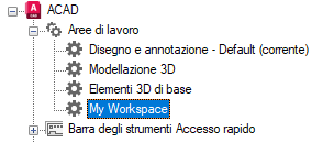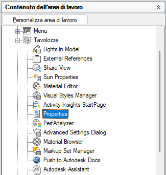 Nella scheda Personalizza, nel riquadro Personalizzazioni in <nome file>, espandere Aree di lavoro e selezionare l'area di lavoro contenente la tavolozza che si desidera modificare.