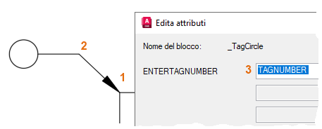 Utilizzando lo snap ad oggetto Punto finale, fare clic su un angolo del rettangolo per specificare la posizione della punta della freccia (1). Quindi fare clic su una posizione per la linea di collegamento della direttrice (2), digitare una lettera o un valore numerico nella finestra di dialogo Edita attributi (3) e fare clic su OK.