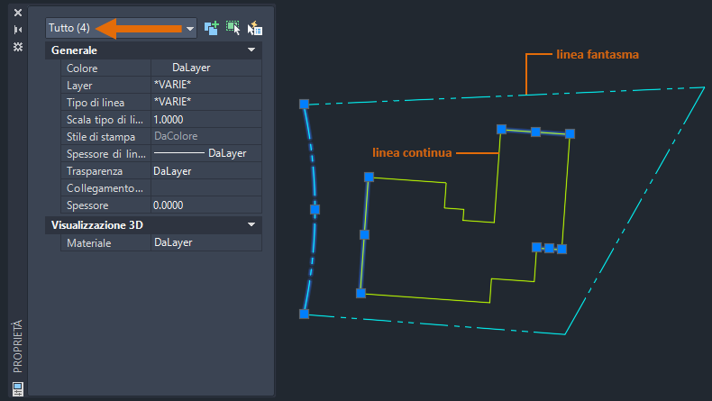 Ora, quando seleziono la linea continua, viene visualizzata nella tavolozza Proprietà come oggetto polilinea.