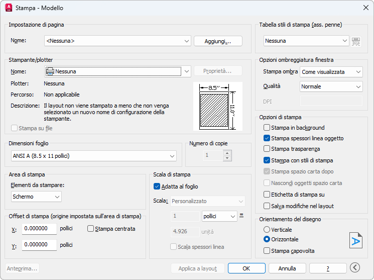 Ad ogni scheda di layout nel disegno può essere associata un'impostazione di pagina. Questa opzione è utile se si utilizzano più dispositivi o più formati di output o se sono definiti diversi layout con varie dimensioni di foglio nello stesso disegno.