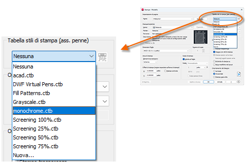 Nella tabella stili di stampa vengono fornite informazioni sull'elaborazione dei colori. I colori visualizzati correttamente sul monitor possono non essere adatti ad un file PDF o alla stampa. Ad esempio, può essere necessario creare un disegno a colori, ma generare un output monocromatico. Di seguito è riportata la procedura per specificare un output monocromatico: