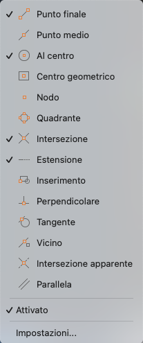 Nella finestra di dialogo Impostazioni disegno, nella scheda Snap ad oggetto, selezionare gli snap ad oggetto che si desidera utilizzare.