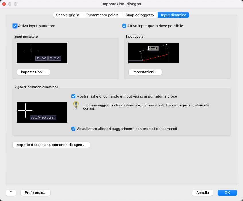Controlla input del puntatore, input quota, righe di comando dinamiche e l'aspetto delle descrizioni comando del disegno.