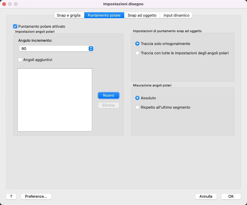 Se è selezionata l'opzione Angoli aggiuntivi, sono elencati gli angoli aggiuntivi disponibili. Per aggiungere nuovi angoli, scegliere Nuovo. Per rimuovere angoli esistenti, fare clic su Elimina. (Variabile di sistema POLARADDANG)