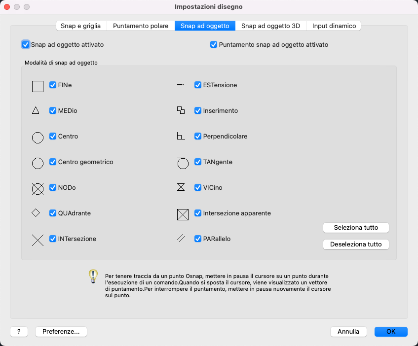 consente di controllare le impostazioni delle modalità snap ad oggetto. Con le impostazioni di snap ad oggetto, anche dette modalità Osnap, è possibile specificare un punto snap in un punto esatto di un oggetto. Nel caso in cui sia stata selezionata più di una modalità, vengono applicate le modalità di snap selezionate per indicare il punto più vicino al centro della casella di apertura. Premere TAB per passare da un'opzione all'altra.