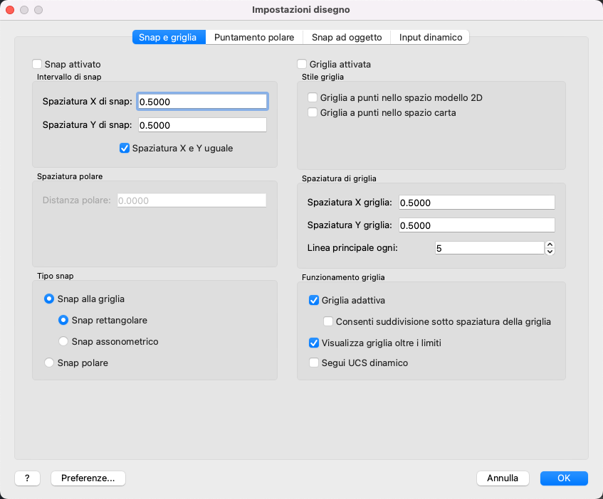 Consente di specificare le impostazioni relative alla griglia e allo snap.