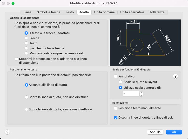 Consente di controllare la posizione del testo di quota, delle punte di freccia, delle linee direttrici e della linea di quota.