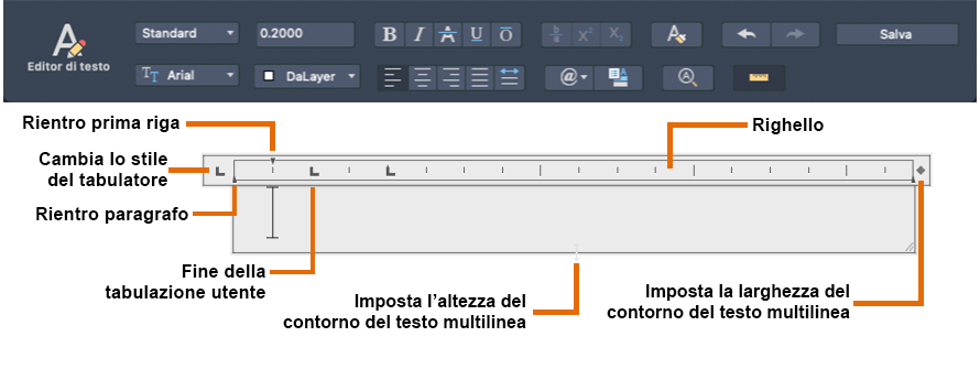 È possibile importare o incollare da altri file il testo da utilizzare nel testo multilinea, impostare le schede, regolare l'allineamento e la spaziatura di linee e paragrafi, nonché creare e modificare le colonne.