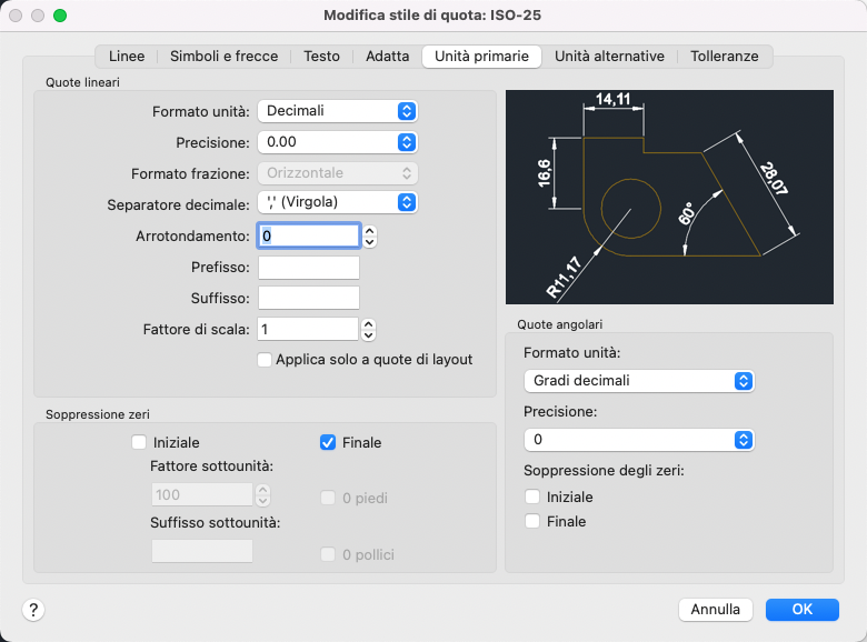 Consente di impostare il formato e la precisione delle unità di quota primarie, nonché i prefissi e i suffissi del testo di quota.