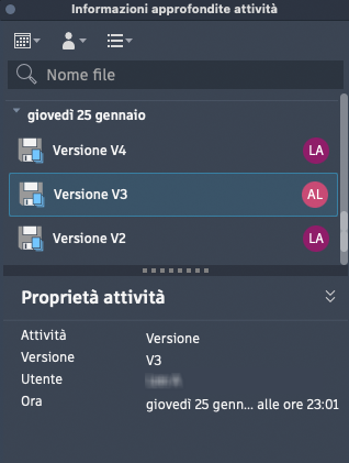 Nota: in AutoCAD LT vengono registrate tutte le attività di disegno, ma attualmente sono mostrate solo le attività Versione all'interno della relativa tavolozza.