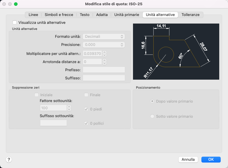 Specifica la visualizzazione delle unità alternative in misurazioni della quota e ne imposta il formato e la precisione.