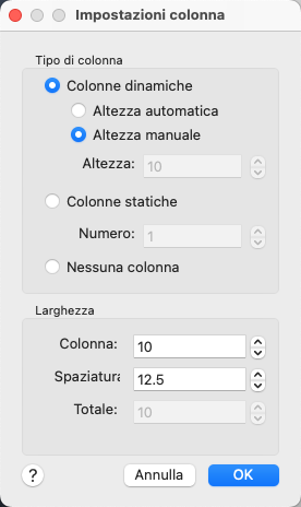 Visualizza le opzioni per l'impostazione delle colonne, quali il tipo, il numero di colonne, l'altezza, la larghezza e le dimensioni della spaziatura tra le colonne.