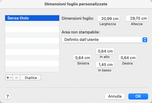 : Dimensioni foglio: Gestisci dimensioni personalizzate
