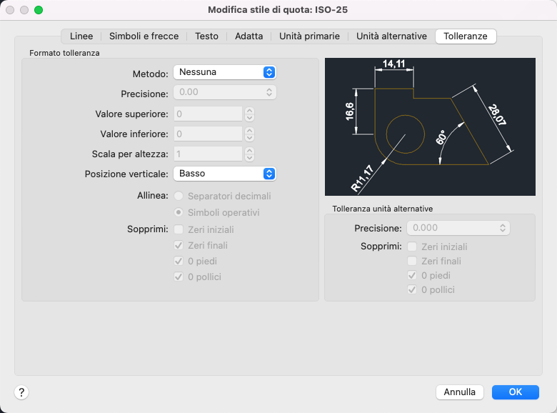 Specifica la visualizzazione e il formato delle tolleranze del testo di quota.