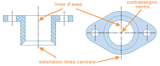 Linee d'asse e centri sono riferimenti di quotatura a centri di fori e assi di simmetria.