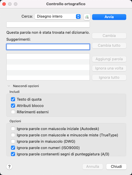 Specifica le opzioni di testo da sottoporre a controllo nel disegno.