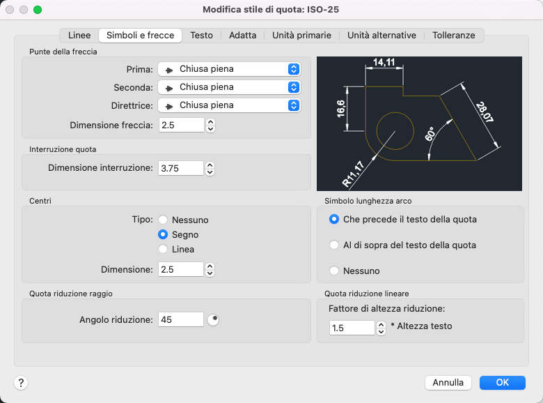 Imposta il formato per il posizionamento di simboli di frecce, centri, lunghezza dell'arco e quote ridotte di raggio.