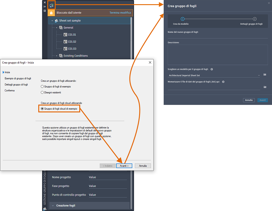 In questa release, Gestione gruppo di fogli per il Web consente di creare facilmente un gruppo di fogli in Autodesk Docs, sia che si utilizzi la versione desktop di AutoCAD o l'app AutoCAD per il Web.