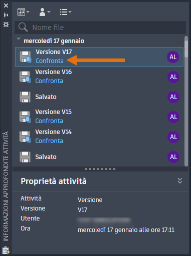 Cronologia DWG è stata unita a Informazioni approfondite attività. Pertanto, quando viene salvato un file con un provider di servizi di memorizzazione nel cloud supportato, ad esempio Autodesk Docs, Google Drive, OneDrive, Box e Dropbox, compare una nuova versione del file come un'attività Versione nella tavolozza Informazioni approfondite attività. Fare clic su Confronta all'interno dell'attività Versione per visualizzare le differenze tra la versione corrente e quella precedente.