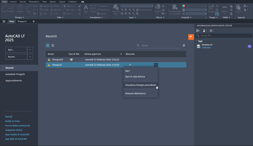 È inoltre possibile visualizzare più versioni di un disegno senza aprire il file. Nella scheda Inizio, fare clic su Recenti e selezionare il disegno. Quindi, fare clic sui puntini di sospensione verticali e selezionare Visualizza cronologia disegni per visualizzare le attività del disegno nella tavolozza ancorata.