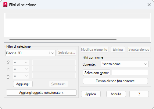 Consente di selezionare, modificare e assegnare i nomi ai filtri per la selezione degli oggetti.