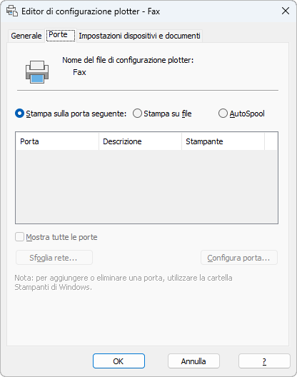 Visualizza le porte disponibili sulla rete, per consentire la connessione ad un'altra istanza di un plotter non di sistema.
