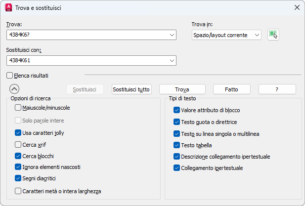 Ad esempio, se si dispone di più parti simili nel disegno, ma è necessario modificarle tutte in 4384K61, immettere 4384K6? nella casella Trova e 4384K61 nella casella Sostituisci con.